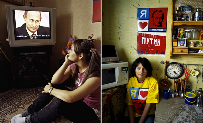 Για τους φοιτητές που βλέπετε στις φωτογραφίες, ο Βλαντιμίρ Πούτιν δεν είναι απλώς ακόμα ένας πολιτικός. Λατρεύεται σαν ροκ σταρ ή σαν ένας διάσημος αθλητής, αποτελεί το είδωλο τους που κοσμεί τους τοίχους των δωματίων τους, ή ακόμα και τα μπλουζάκια τους.