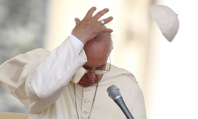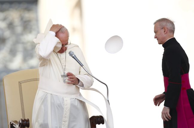 Ο αέρας πέταξε το καπελάκι του μακριά από τον Ποντίφικα, με αποτέλεσμα ένας ιερέας να προσπαθεί για να το πιάσει.