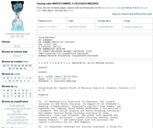 Η ιστοσελίδα Wikileaks δημοσίευσε σήμερα το τηλεγράφημα ενός αμερικανού διπλωμάτη, ο οποίος περιέγραφε ένα γάμο στον Καύκασο κατά τη διάρκεια του οποίου ο πρόεδρος της Τσετσενίας, Ραμζάν Καντίροφ, προσέφερε στους νιόπαντρους 5 κιλά χρυσού ως γαμήλιο δώρο, έρανε τους προσκεκλημένους με χαρτονομίσματα και χόρευε έχοντας στην πίσω τσέπη του παντελονιού του ένα επιχρυσωμένο αυτόματο όπλο.