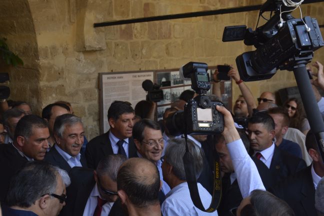 Αναστασιάδης και Ακιντζί περπάτησαν πρώτα σε δρομάκια στο κατεχόμενο τμήμα της, εντός των ενετικών τειχών, Λευκωσίας. Συνομίλησαν με καταστηματάρχες, πολίτες και τουρίστες. Η περιδιάβαση κατέληξε στο Buyuk Han, το Μεγάλο Χάνι, όπου ήπιαν καφέ και λεμονάδα.