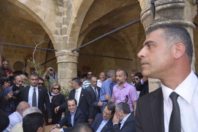 Τον κ . Αναστασιάδη συνόδευαν ο κυβερνητικός εκπρόσωπος, Νίκος Χριστοδουλίδης, ο δήμαρχος Λευκωσίας Κωνσταντίνος Γιωρκάτζης και ο Ελληνοκύπριος διαπραγματευτής Ανδρέας Μαυρογιάννης. Ο κύριος Ακκιντζί συνοδευόταν από τον κ. Μπαρίς Μπουρτζιού, τον Τουρκοκύπριο δήμαρχο Μεχμέτ Χαρμαντζί και τον διαπραγματευτή Οζντίλ Ναμί.