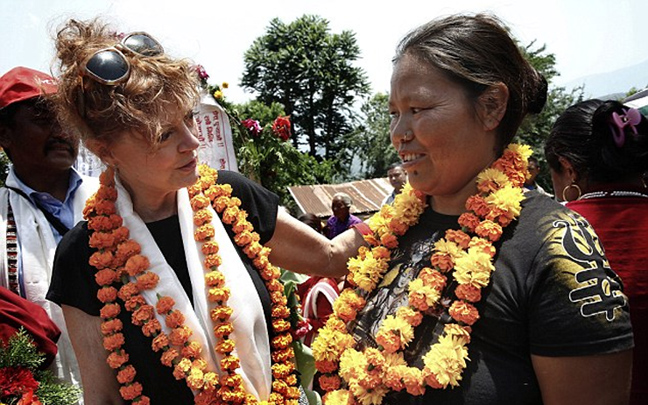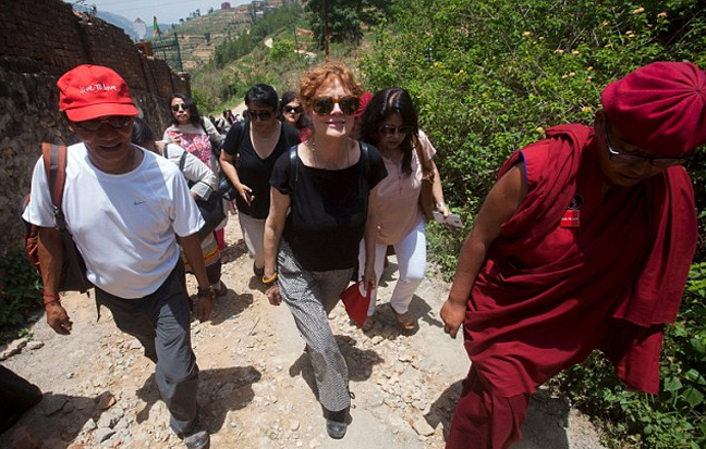 Ντυμένη απλά η διάσημη ηθοποιός δέχθηκε με χαρά τη γιρλάντα με άνθη που της προσέφεραν πολίτες του Νεπάλ.