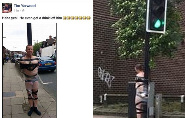 Η υπόλοιπη παρέα απολάμβανε τις μπύρες της σε κοντινή παμπ και παρακολουθούσε τον μέλλοντα γαμπρό να πίνει τη μπύρα του δεμένος με μονωτική ταινία στο στύλο και να φωτογραφίζεται από τους περαστικούς.