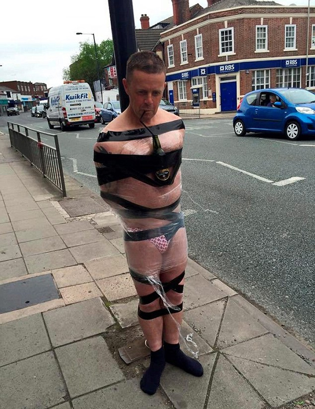 Ο 41χρονος Lee Forrester παρέμεινε το Σάββατο δεμένος ή μάλλον κολλημένος στο φανάρι για μισή ώρα μέχρι οι φίλοι του να τον απαλλάξουν από τον εξευτελισμό αυτό.