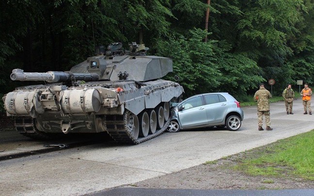 Αυτό συνέβη στη Γερμανία, στην περιοχή Lippe, όταν μια 18χρονη που μάθαινε τα μυστικά της οδήγησης, κατάφερε και συνέθλιψε το Toyota Yaris με αυτόν τον απίθανο τρόπο. Σύμφωνα με την τοπική αστυνομία, σταμάτησε μπροστά από στρατιωτικά οχήματα του βρετανικού στρατού που κινούνταν στον περιφερειακό δρόμο, γύρω από την πόλη, που συχνά χρησιμοποιείται από τις βρετανικές δυνάμεις που σταθμεύουν σε κοντινή απόσταση με τανκ και άλλα τεθωρακισμένα οχήματα.