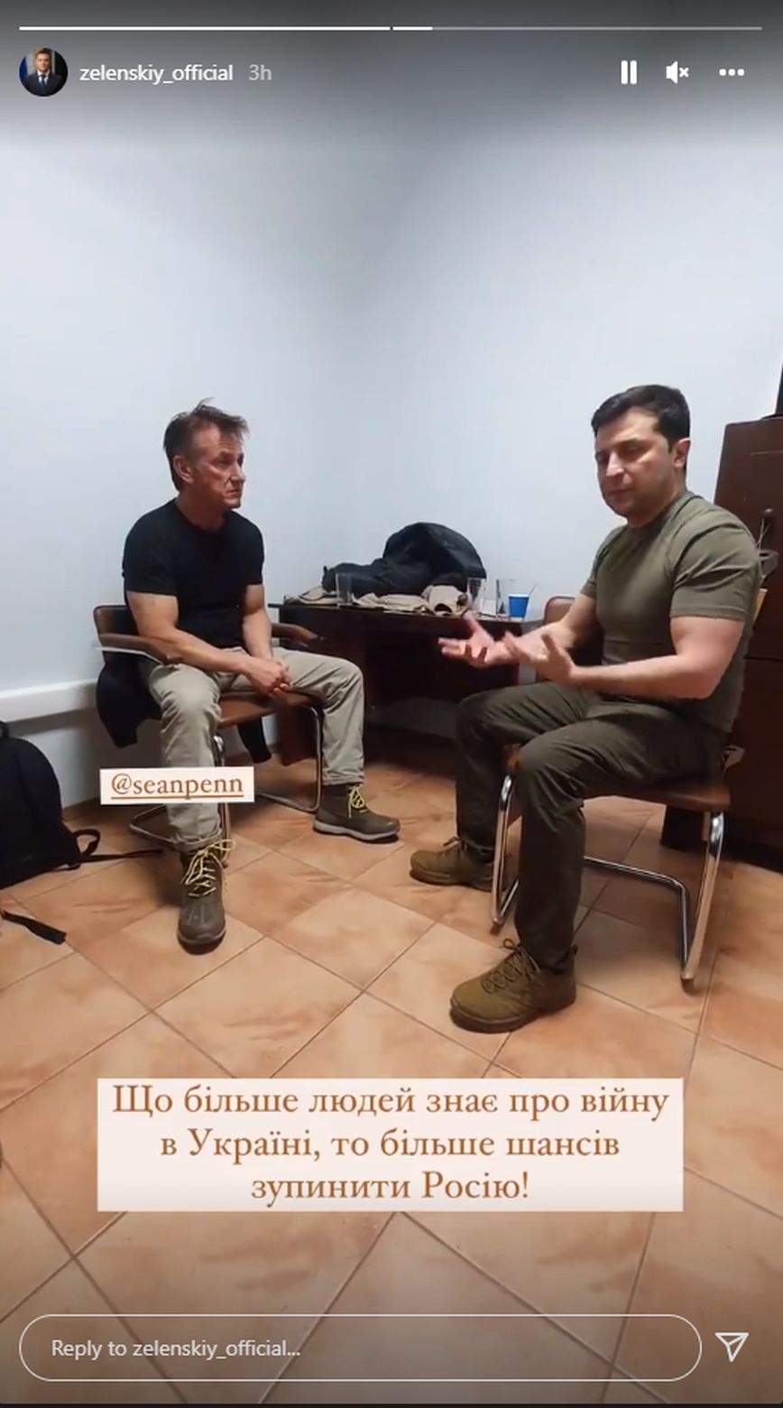 Ο Βολοντομίρ Ζελένσκι δημοσίευσε στον προσωπικό του λογαριασμό στο Instagram φωτογραφία από την συνομιλία που είχε με τον Σον Πεν μετά το τέλος της ενημέρωσης.