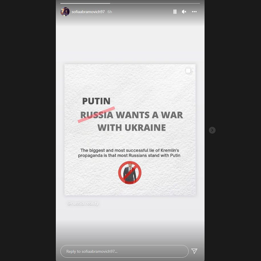 Η 27χρονη που περνάει αρκετό χρόνο στη Βρετανία με story στον λογαριασμό της στο Instagram τάσσεται στο πλευρό της Ουκρανίας, γράφοντας χαρακτηριστικά ότι ο Πούτιν θέλει πόλεμο με την Ουκρανία και όχι η Ρωσία.