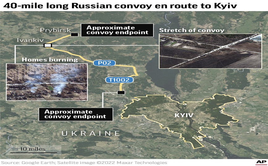 Το ΑΠΕ-ΜΠΕ αναμεταδίδει από τα διεθνή πρακτορεία, ότι φωτογραφίες από την αμερικανική εταιρεία δορυφορικών εικόνων Maxar που δόθηκαν στη δημοσιότητα τη νύχτα από Δευτέρα προς Τρίτη έδειξαν μια μακρά ρωσική οχηματοπομπή να προελαύνει προς την πρωτεύουσα.