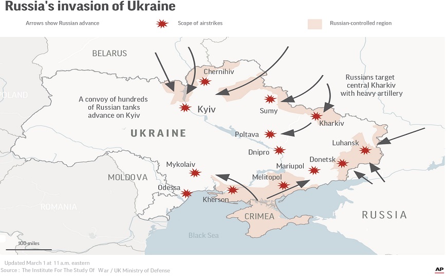 Το Γαλλικό Πρακτορείο αναφέρει ότι ρωσικά αερομεταφερόμενα στρατεύματα προσγειώθηκαν στο Χάρκοβο, τη δεύτερη μεγαλύτερη πόλη της χώρας. Μετά από πολυάριθμες βομβιστικές επιθέσεις την Τρίτη στο κέντρο της πόλης, οι οποίες σκότωσαν τουλάχιστον 21 ανθρώπους σύμφωνα με τον περιφερειάρχη, νέα πλήγματα έπληξαν το περιφερειακό αρχηγείο των δυνάμεων ασφαλείας και της αστυνομίας σήμερα, πρωί της Τετάρτης, καθώς και το πανεπιστήμιο αυτής της μητρόπολης που βρίσκεται 50 χλμ. από τα ρωσικά σύνορα, σύμφωνα με τις υπηρεσίες έκτακτης ανάγκης.