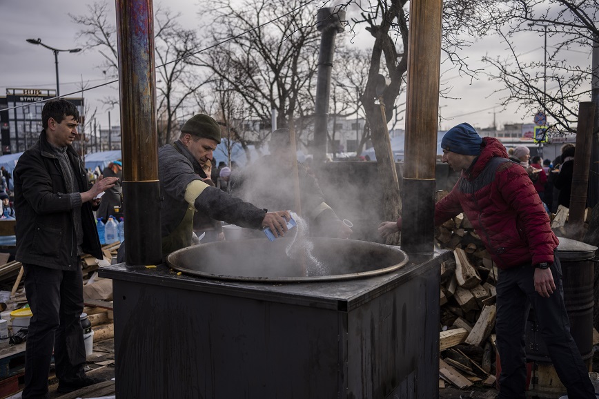 Παράλληλα, αρκετοί πολίτες διοργανώνουν συσσίτια για τον πληθυσμό που διαμένει στα καταφύγια, καθώς αρκετοί Ουκρανοί έχουν εγκλωβιστεί στις μεγάλες πόλεις, ενώ άλλοι δεν επιθυμούν να εγκαταλείψουν τα σπίτια τους, ειδικά χωρίς να δώσουν μάχη.