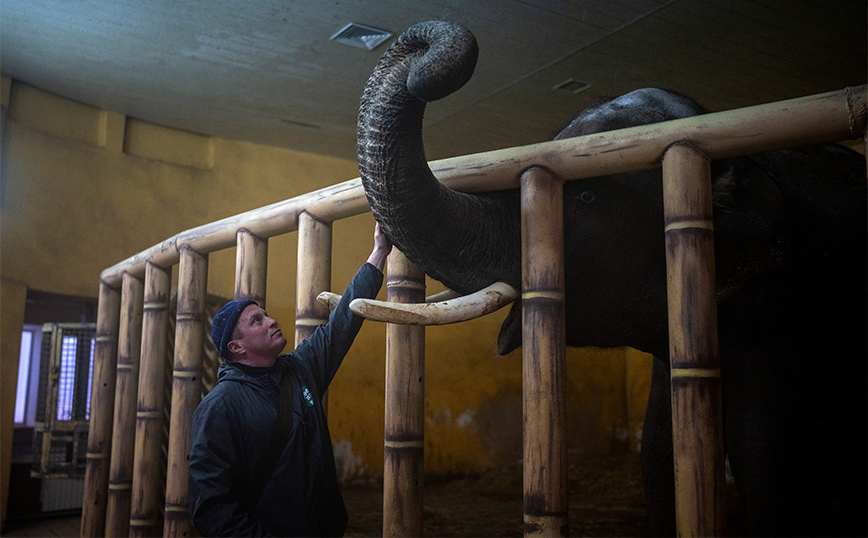 Ούτε οι ελέφαντες δεν μπόρεσαν να γλιτώσουν από τους βομβαρδισμούς στο Κίεβο, με τον υπάλληλο του ζωολογικού κήπου στην πρωτεύουσα της Ουκρανίας να προσπαθεί να ηρεμήσει το μεγάλο ζώο που έχει τρομοκρατηθεί.