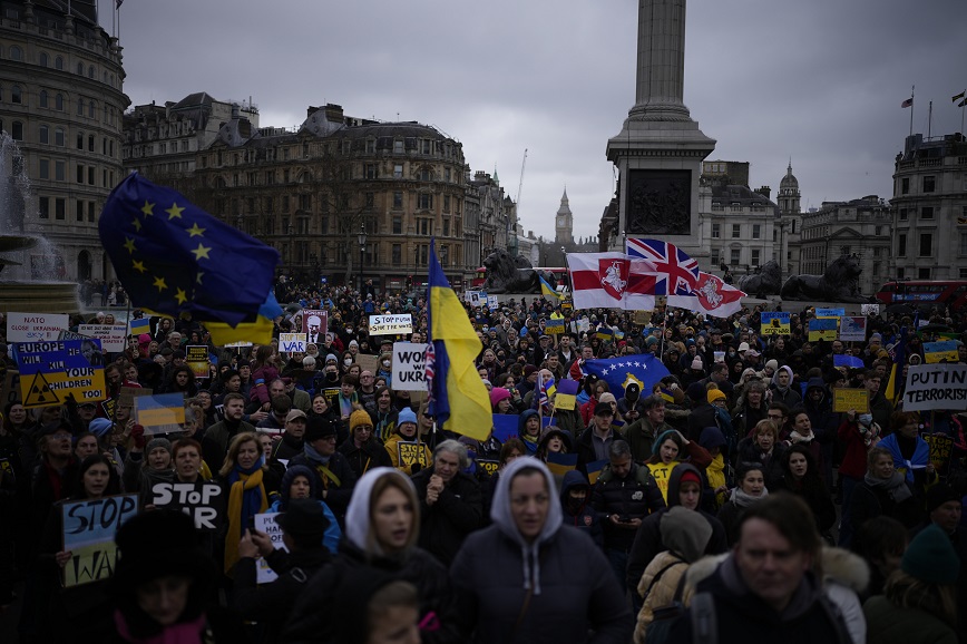 Χαρακτηριστικά, το Γαλλικό Πρακτορείο αναφέρει πως στο Λονδίνο, ένα πλήθος εκατοντάδων ανθρώπων συγκεντρώθηκε στην πλατεία Τραφάλγκαρ, κρατώντας πλακάτ με συνθήματα όπως «Ο Πούτιν σκοτώνει» και «Πλήρες εμπάργκο στη Ρωσία». Οι συγκεντρωμένοι φώναζαν «Σταματήστε τον Πούτιν, σταματήστε τον πόλεμο».
