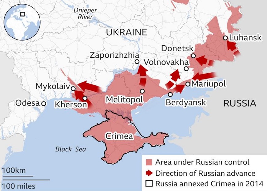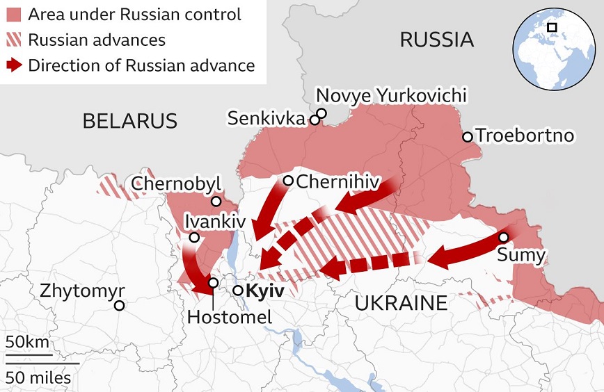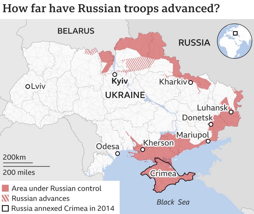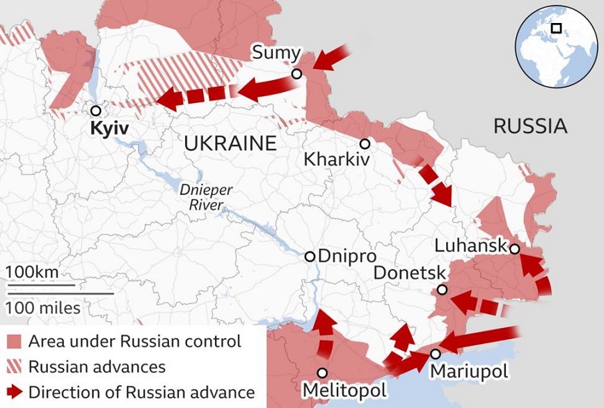 Όπως αναφέρει δημοσίευμα του bbc.com, η Μόσχα ελέγχει σχεδόν όλο τον Βορρά έως το Λουχάνσκ -εξαίρεση ένα μικρό κομμάτι- ενώ έχει σχεδόν αποκόψει την πρόσβαση της Ουκρανίας στη θάλασσα, αφού περικύκλωσε και την Μαριούπολη. Ουκρανικά σχέδια εκκένωσης της Βολνοβάχα και της Μαριούπολης εγκαταλείφθηκαν γρήγορα, ενώ σε ρωσικά χέρια πέφτουν αρκετά εδάφη έξω από το Κίεβο, κυρίως προς τα δυτικά.