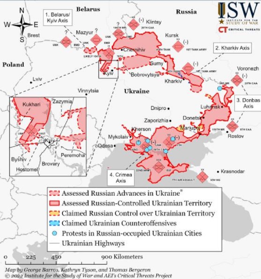 Το αμερικανικό Ινστιτούτο για τη Μελέτη του Πολέμου (ISW) σε ανάλυση που παρουσίασε το βράδυ της Δευτέρας (7/3), σημείωσε ότι η ουκρανική πρωτεύουσα είναι σχεδόν περικυκλωμένη από παντού. Μάλιστα, παραθέτει ενδεικτικό χάρτη και φαίνεται ότι μόνο τα εδάφη που βρίσκονται στα νότια του Κιέβου, είναι υπό τον ουκρανικό έλεγχο.