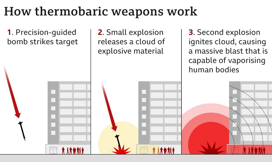 Η θερμοβαρική βόμβα μπορεί να χρησιμοποιείται κυρίως σε πόλεις και συνήθως τα θύματα να είναι άμαχοι και όχι στρατιώτες, όμως ακόμη επιτρέπεται.