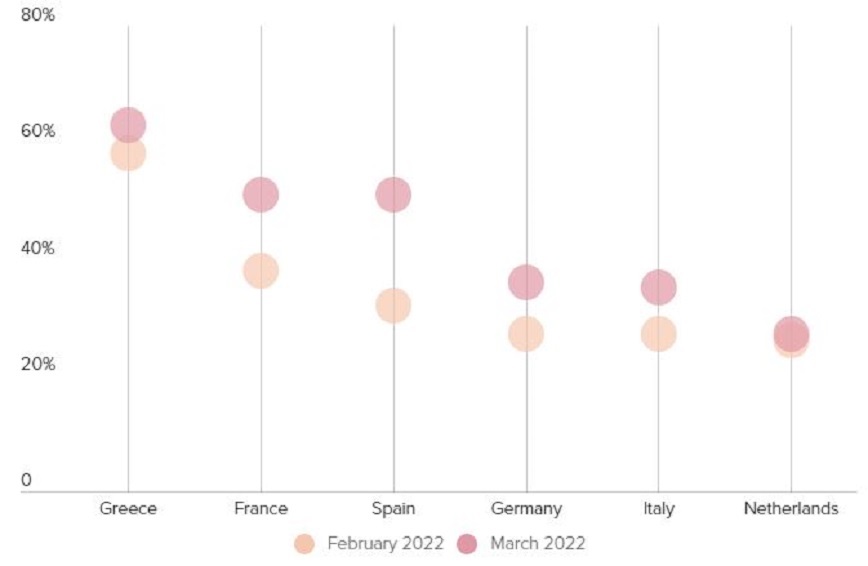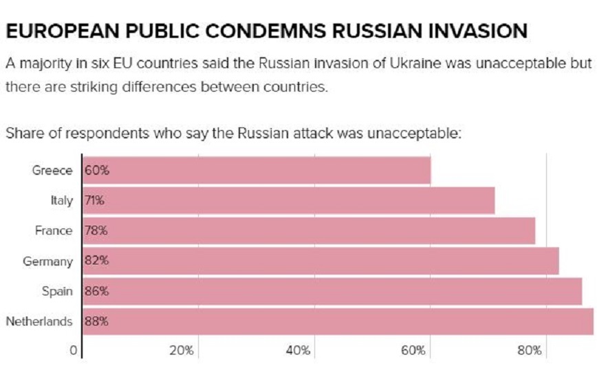 Πιο αναλυτικά, όπως αναφέρει το politico.eu, η έρευνα έγινε μεταξύ 8 και 11 Μαρτίου με συμμετοχή πολιτών από Ισπανία, Γερμανία, Ελλάδα, Γαλλία, Ολλανδία και Ιταλία, με την πλειοψηφία να στηλιτεύει την ρωσική εισβολή. Χαρακτηριστικά, το 60% των Ελλήνων διαφωνεί με την εισβολή που διεξάγει η Ρωσία, ενώ στην Ολλανδία οι επικρίσεις αγγίζουν το 88%.