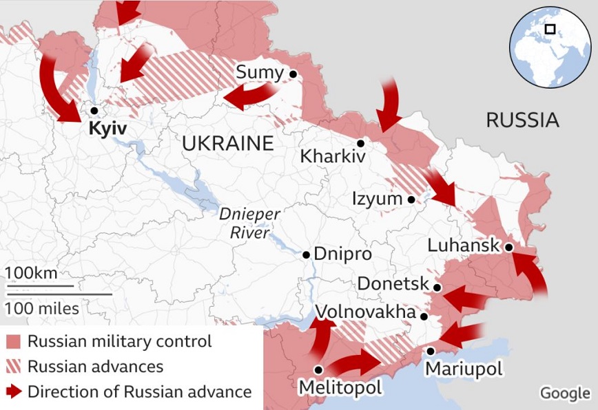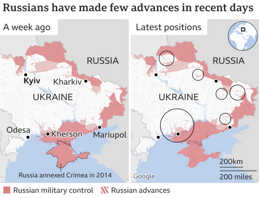 Επιπλέον, σύμφωνα με χάρτες του bbc.com, φαίνεται οι χερσαίες επιθέσεις να έχουν σταματήσει προς το Κίεβο στο Βορρά, όπως και προς την Οδησσό στο Νότο, όπου μάλιστα υπήρξε μικρή υποχώρηση του ρωσικού στρατού προς το Μικολάιφ, το οποίο σφυροκοπεί.