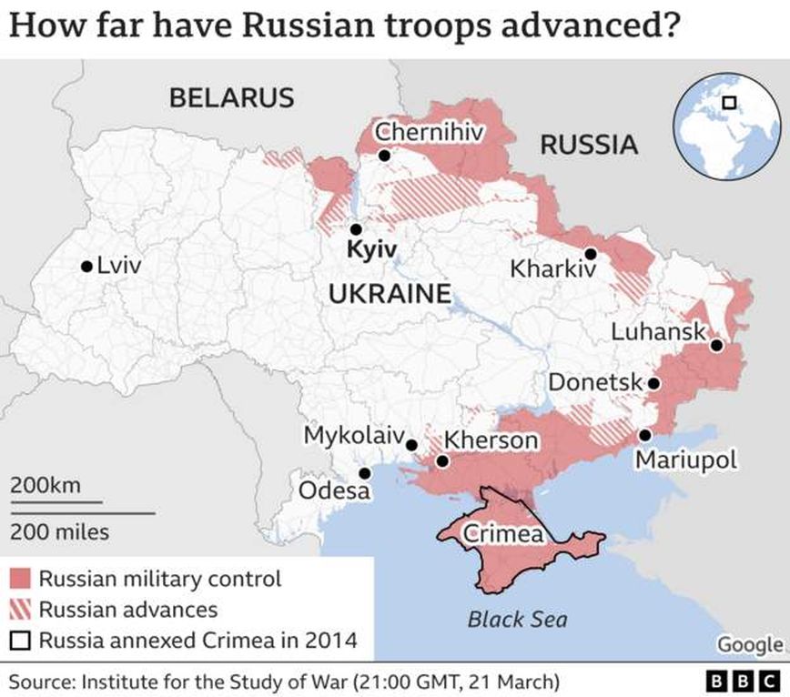 Έναν σχεδόν μήνα με τη εισβολή στην Ουκρανία, ο ρωσικός στρατός δεν έχει κυριεύσει παρά μόλις μια μεγάλη πόλη, αν και έχει περικυκλώσει αρκετές άλλες. Στην πολιορκημένη Μαριούπολη, κάπου 100.000 άνθρωποι παραμένουν αποκλεισμένοι και υπομένουν συνεχείς βομβαρδισμούς. Στη χώρα έχουν σκοτωθεί μέχρι στιγμής 121 παιδιά, ανακοίνωσε το γραφείο του γενικού εισαγγελέα της χώρας με ανάρτησή του στην εφαρμογή Telegram, ενώ πρόσθεσε ότι άλλα 167 παιδιά έχουν τραυματιστεί.