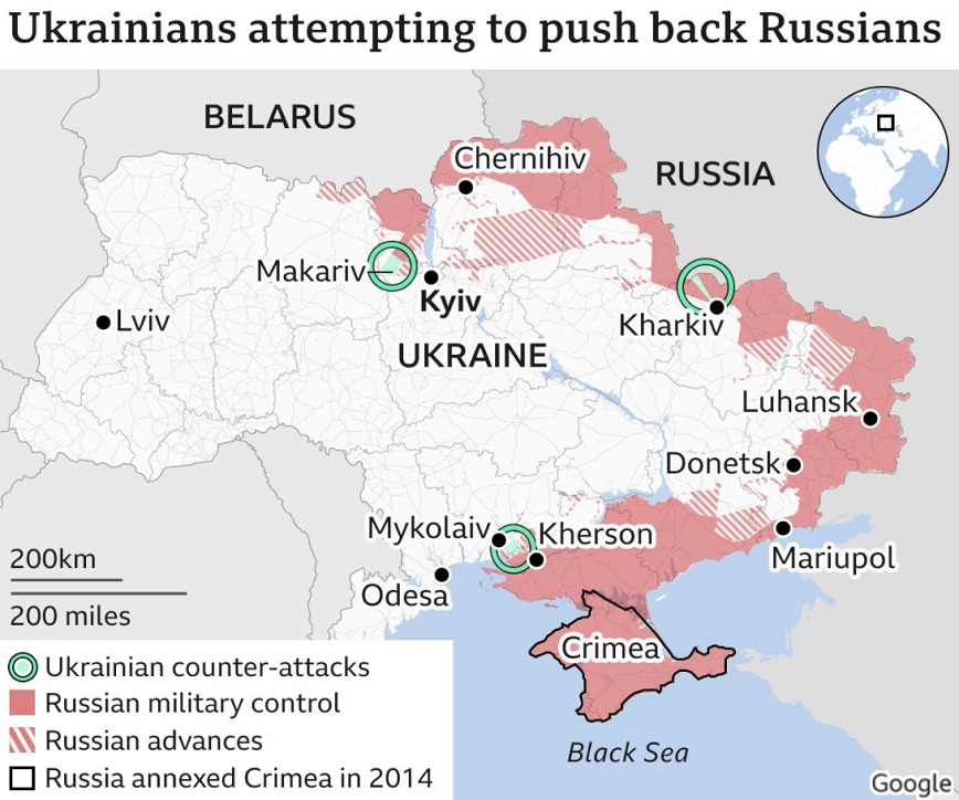 Σύμφωνα με χάρτες που παραθέτει το bbc.com, οι ουκρανικές δυνάμεις ισχυρίζονται ότι βύθισαν ρωσικό αποβατικό πλοίο στο λιμάνι του Μπερντιάνσκ -βρίσκεται δυτικά της Μαριούπολης-, ενώ φέρεται να έχουν πραγματοποιήσει επιτυχημένες αντεπιθέσεις κοντά στην πρωτεύουσα το Κίεβο.