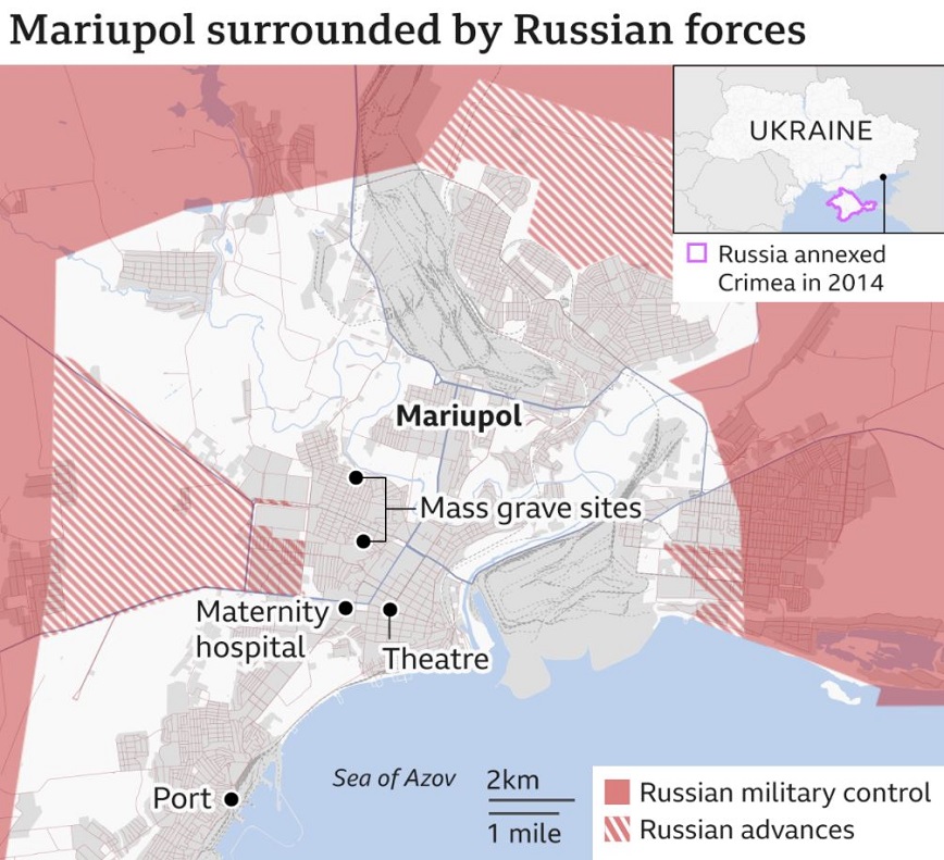 Παρόλα αυτά, ο ρωσικός στρατός πιέζει προς τα ανατολικά και ειδικότερα στο Ντονμπάς, δηλαδή προς τις ρωσόφωνες περιοχές, στις οποίες ήδη δραστηριοποιούνται από το 2014 αυτονομιστικές οργανώσεις, προσκείμενες στη Μόσχα. Μάλιστα, σύμφωνα με χάρτη του BBC, οι Ρώσοι έχουν αρχίσει να καταλαμβάνουν την Μαριούπολη, ενώ ήδη έχουν φτάσει προς το νοσοκομείο, που βομβάρδισαν τις πρώτες μέρες του πολέμου.