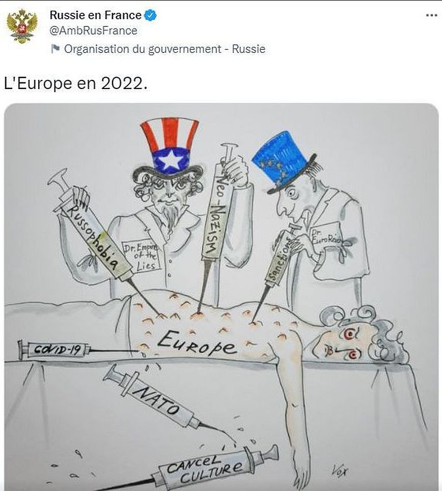 Η ρωσική πρεσβεία στο Παρίσι ανήρτησε χθες ένα σκίτσο που δείχνει μία σορό να κείτεται σε ένα τραπέζι, το οποίο ονομάζεται «Ευρώπη», ενώ χαρακτήρες που απεικονίζουν τις ΗΠΑ και την Ευρωπαϊκή Ένωση το τρυπάνε με βελόνες.