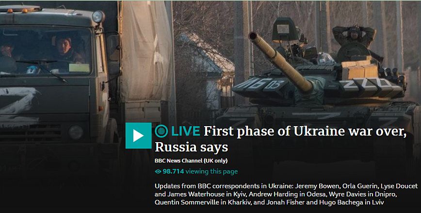 Παράλληλα το BBC γράφει ότι η πρώτη φάση του πολέμου στην Ουκρανία έχει περάσει.