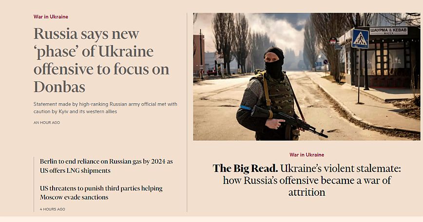 Τέλος σύμφωνα με δημοσίευμα των Financial Times, υψηλόβαθμοι Ρώσοι αξιωματούχοι διεμήνυσαν ότι στοχεύουν στρατιωτικά στα ανατολικά της Ουκρανίας, στην περιοχή του Ντονμπάς, γεγονός που θα μπορούσε να σημαίνει ότι το Κρεμλίνο περιορίζει τις επιθέσεις σε άλλες περιοχές της χώρας.