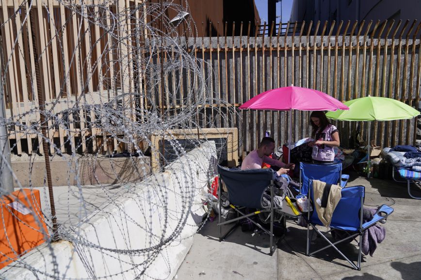 Άνθρωποι σκορπισμένοι, τυλιγμένοι με κουβέρτες, σε ξαπλώστρες δίπλα σε υπερβολικά γεμάτες βαλίτσες πάνω σε γρασίδι κοντά στο διεθνές λιμάνι εισόδου. Ορισμένοι κοιμούνται σε σκηνές και κάτω από μουσαμάδες. Αμερικανοί εθελοντές με κίτρινα γιλέκα – ορισμένοι Ουκρανό-αμερικανοί που ταξίδεψαν στην Τιχουάνα αφού άκουσαν για τους πρόσφυγες που έφτασαν – συλλέγουν ονόματα σε μια χειρόγραφη λίστα αναμονής για να καταγράφουν τα ονόματα των αφιχθέντων.