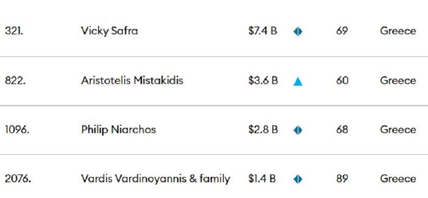 Στη συνέχεια, ακολουθούν στη θέση 822 ο Αριστοτέλης Μυστακίδης, ο οποίος ήταν επί σειρά ετών επικεφαλής της Glencore, μίας από τις μεγαλύτερες βιομηχανίες χαλκού παγκοσμίως, με περιουσία 3,6 δισ. δολαρίων και ο Φίλιππος Νιάρχος, γιος του Σταύρου Νιάρχου, ο οποίος βρίσκεται στη θέση 1.096 με περιουσία 2,8 δισ. δολάρια. Έπειτα, στη θέση 2.076 του Forbes είναι η οικογένεια του Βαρδή Βαρδινογιάννη με περιουσιακά στοιχεία αξίας 1,4 δισ. δολαρίων.