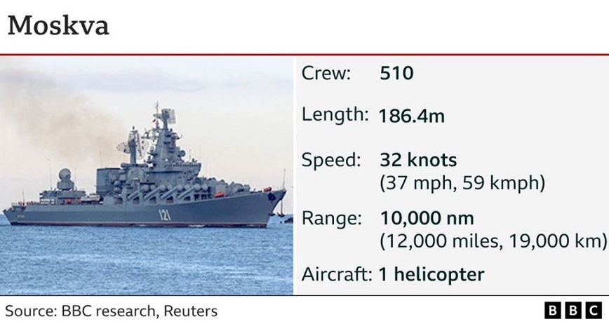 Επίσης, όπως αναφέρει το βρετανικό δημοσίευμα, το Moskva είναι καταδρομικό κλάσης Slava και το τρίτο μεγαλύτερο σκάφος στο ρωσικό στόλο, ενώ ναυπηγήθηκε στην Ουκρανία την εποχή της ΕΣΣΔ το 1980. Διαθέτει πλήρωμα 510 ατόμων και μεταφέρει πάνω από δώδεκα αντιπλοϊκούς πυραύλους Vulkan και μια σειρά από όπλα κατά υποβρυχίων και ναρκοπεδίων.