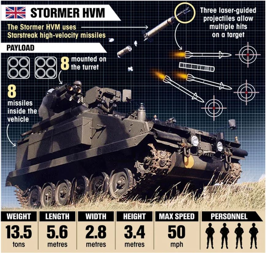 Τα Stormer, που κατασκευάζει η BAE Systems, χρειάζονται τριμελές πλήρωμα. Εκτοξεύουν πυραύλους Starstreak, που μπορούν να καταρρίπτουν αεροσκάφη που πετούν σε χαμηλό ύψος ή επιθετικά ελικόπτερα.