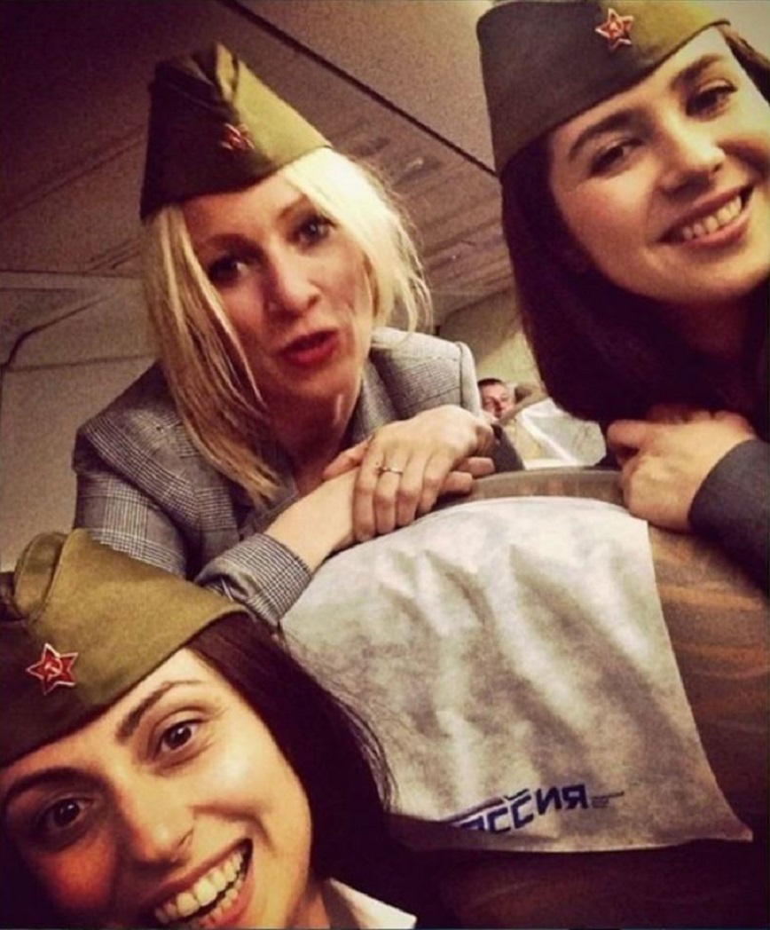 Χαρακτηριστικά, φέρνει ως παράδειγμα μία πτήση στη Νορβηγία από το 2017, όπου η Μαρία Ζαχάροβα εμφανίζεται δίπλα στην πορνοστάρ Anastasia Vashukevich από την Λευκορωσία και έβγαλαν φωτογραφία μέσα στο αεροπλάνο του Λαβρόφ.