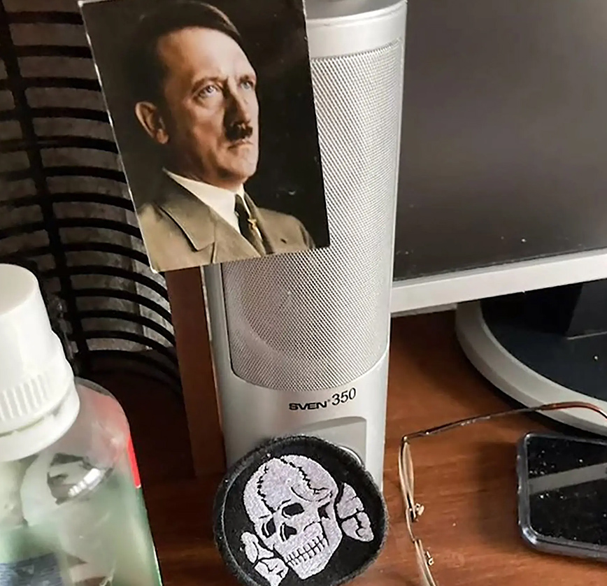 Μια φωτογραφία δείχνει ένα κατακόκκινο μπλουζάκι με μια σβάστικα, ανεξήγητα τοποθετημένο δίπλα σε τρία αντίγραφα του βιντεοπαιχνιδιού «The Sims 3».