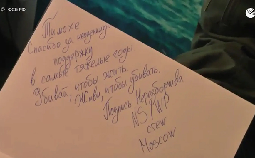 Ένα άλλο βίντεο που διανεμήθηκε από το ρωσικό κρατικό πρακτορείο ειδήσεων RIA έδειξε μια επιγραφή σε ένα άγνωστο βιβλίο που υποτίθεται ότι ανακτήθηκε κατά τη σύλληψη – υπογεγραμμένη στα ρωσικά με τις λέξεις «υπογραφή δυσανάγνωστη».