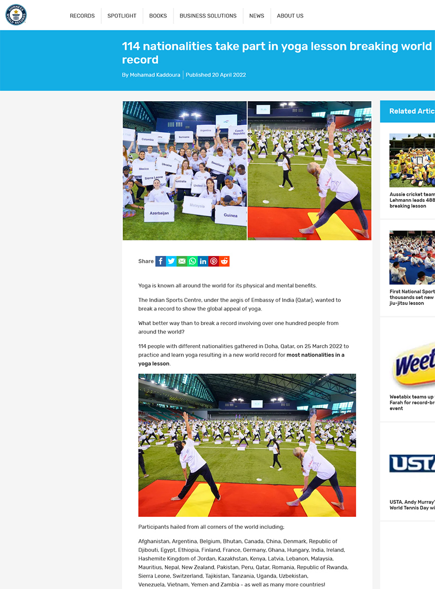 Συνολικά 114 λάτρεις της σωματικής και πνευματικής άσκησης διαφορετικών εθνικοτήτων συγκεντρώθηκαν στη Ντόχα του Κατάρ στις 25 Μαρτίου 2022 για να εξασκηθούν στη γιόγκα, με αποτέλεσμα να κατακτήσουν το νέο παγκόσμιο ρεκόρ για τις περισσότερες εθνικότητες σε ένα μάθημα γιόγκα.