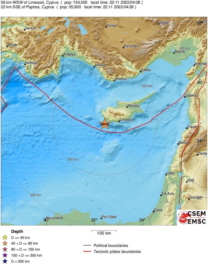 Σεισμική δόνηση μεγέθους 4,9 βαθμών της κλίμακας Ρίχτερ σημειώθηκε πριν λίγη ώρα στη θαλάσσια περιοχή της Κύπρου, ανοιχτά της Πάφου.