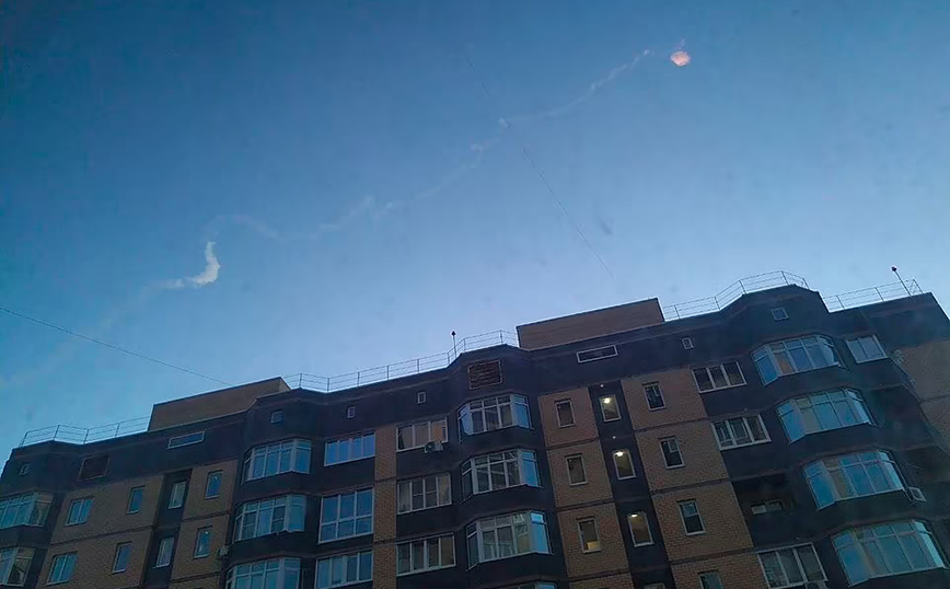 Βίντεο που τραβήχτηκε τα ξημερώματα έδειξε κάτι που φαινόταν να είναι το λευκό ίχνος της εξάτμισης ενός πυραύλου αεράμυνας που διέσχιζε τον ουρανό, με ένα σύννεφο πρόσκρουσης να αιωρείται στον αέρα.