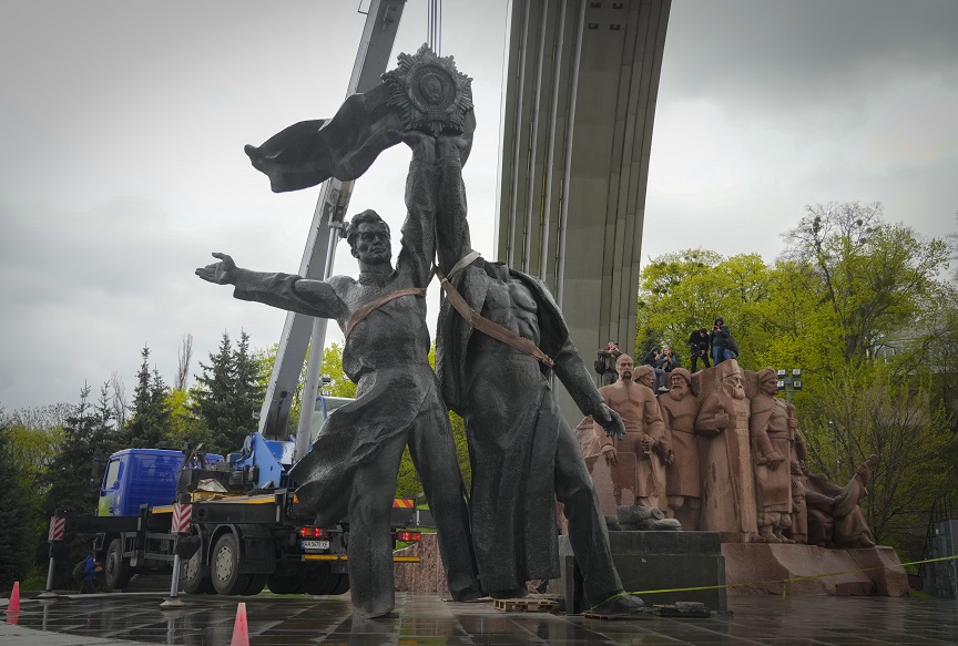 Το γιγαντιαίο μνημείο, που αναπαριστούσε έναν ουκρανό κι έναν ρώσο εργαζόμενο, κατεδαφίστηκε.