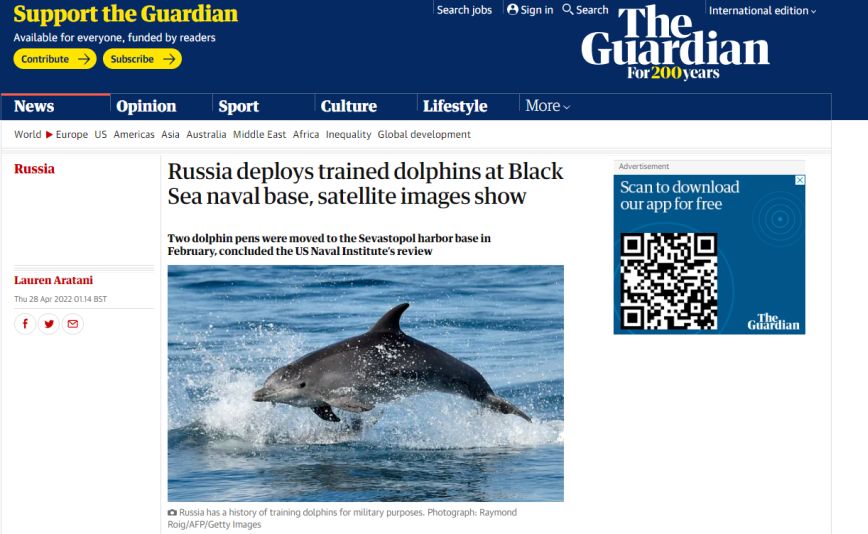 Η Ρωσία έχει αναπτύξει εκπαιδευμένα δελφίνια στη ναυτική βάση της στη Μαύρη Θάλασσα, πιθανώς για να προστατεύσει τον στόλο της από υποβρύχιες επιθέσεις, σύμφωνα με μια νέα ανάλυση δορυφορικών εικόνων που επικαλείται η βρετανική Guardian. Το US Naval Institute (USNI) επανεξέτασε δορυφορικές εικόνες της ναυτικής βάσης στο λιμάνι της Σεβαστούπολης και κατέληξε στο συμπέρασμα ότι δύο περιφράξεις δελφινιών μεταφέρθηκαν εκεί τον Φεβρουάριο, όταν ξεκινούσε η ρωσική εισβολή στην Ουκρανία.