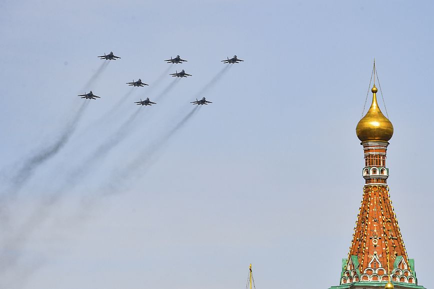 Το όπλο μαζικής καταστροφής ακολούθησαν αρκετοί εκτοξευτές πυραύλων Iskander-M. Οκτώ μαχητικά MiG-29 πέταξαν επίσης σε σχηματισμό «Ζ» – το διακριτικό που χρησιμοποιούσε ο στρατός του Πούτιν ως σύμβολο της στρατιωτικής του δράσης στην Ουκρανία, το οποία οι επικριτές παρομοίασαν με τη σβάστικα που χρησιμοποιούσαν οι Ναζί.