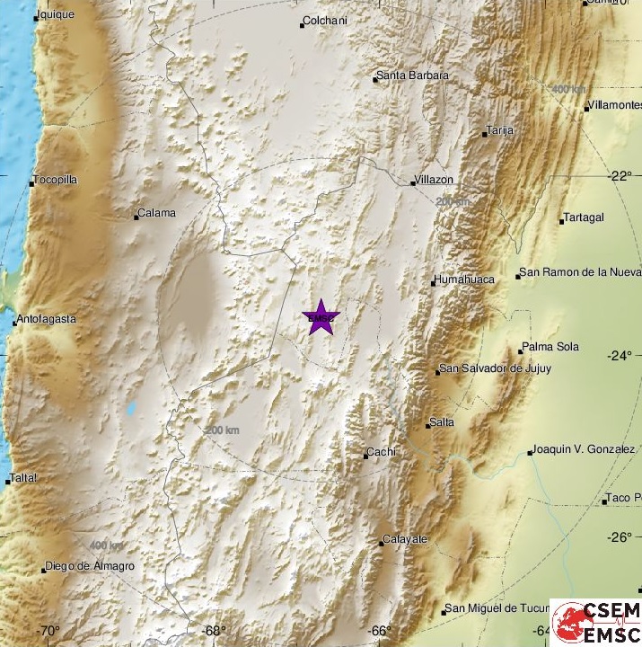 Σεισμική δόνηση 6,8 βαθμών σημειώθηκε στην περιφέρεια Χουχούι της Αργεντινής, ανακοίνωσε το Ευρωμεσογειακό Σεισμολογικό Κέντρο (EMSC).