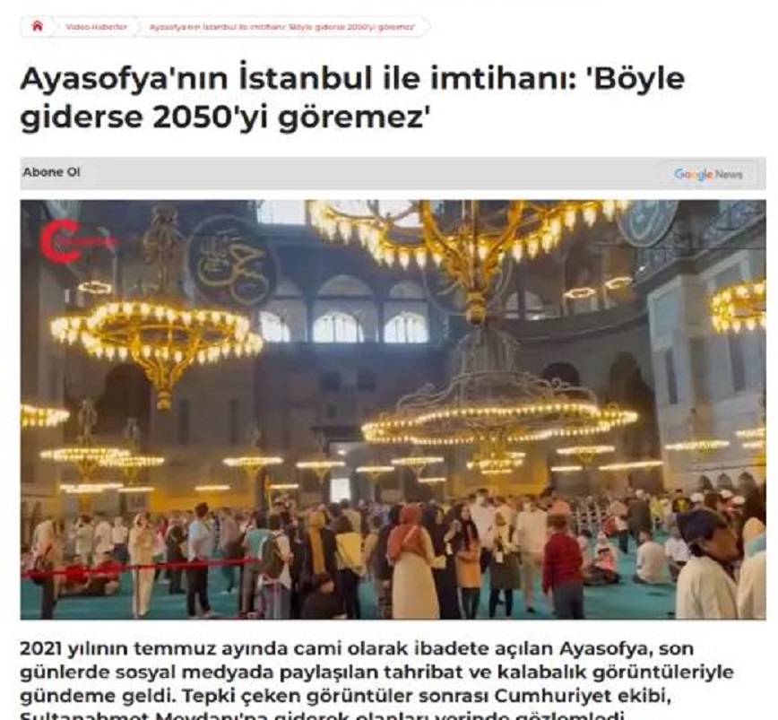 Σε άρθρο με τίτλο «Η Αγία Σοφία είναι τεστ για την Κωνσταντινούπολη: Δεν θα δει το 2050 αν συνεχιστεί αυτή η κατάσταση» που δημοσίευσε στην ηλεκτρονική έκδοση cumhuriyet.com.tr, αναφέρει ότι από τον Ιούλιο του 2020 μέχρι σήμερα το φως της δημοσιότητας έχουν δει εικόνες βανδαλισμού στο εσωτερικό της Αγίας Σοφίας και προσθέτει πως τα πλήθη που συρρέουν καθημερινά σε αυτή συμβάλλουν στην καταστροφή της.
