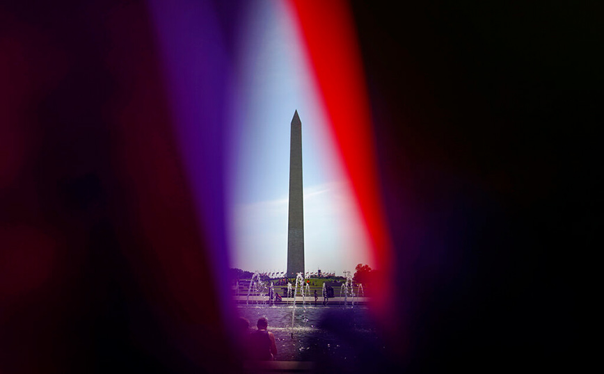 Το Μνημείο της Ουάσινγκτον πλαισιώνεται από κορδέλες σε ένα μνημειακό στεφάνι στο Μνημείο του Β’ Παγκοσμίου Πολέμου την Ημέρα Μνήμης στην Ουάσινγκτον. Φέτος, για πρώτη φορά από το 2019, η παρέλαση, που αποτίνει φόρο τιμής στους βετεράνους και τους άνδρες και τις γυναίκες των υπηρεσιών που έχουν θυσιάσει τη ζωή τους από την εποχή της Αμερικανικής Επανάστασης, πραγματοποιήθηκε ζωντανά.