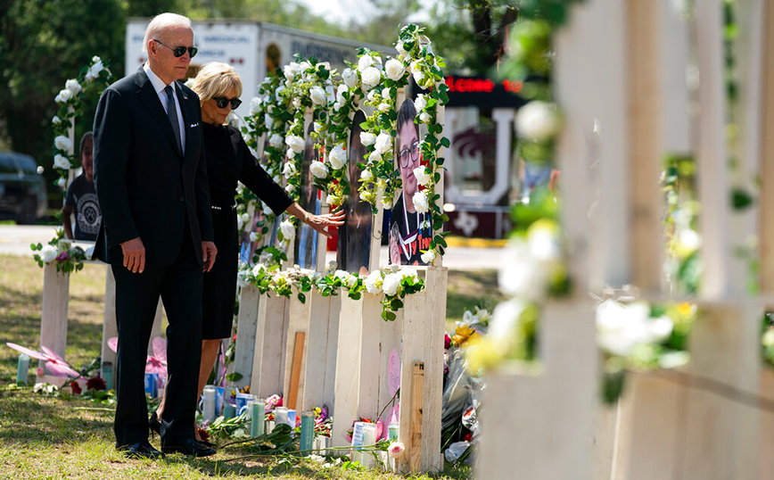 Ο πρόεδρος Τζο Μπάιντεν και η πρώτη κυρία Τζιλ Μπάιντεν επισκέπτονται το μνημείο στο δημοτικό σχολείο Robb για να αποτίσουν φόρο τιμής στα θύματα των μαζικών πυροβολισμών, σε ένα περιστατικό βίας και ρατσισμού που προκάλεσε σοκ στην παγκόσμια κοινότητα την προηγούμενη εβδομάδα.