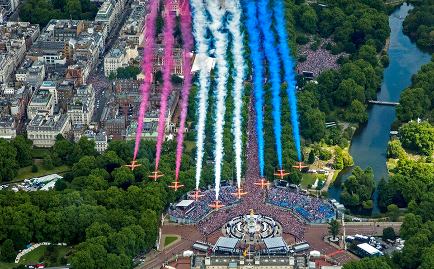 Εντυπωσιακοί σχηματισμοί στον αέρα από τη Βασιλική Πολεμική Αεροπορία με τα χρώματα της βρετανικής σημαίας, στο πλαίσιο των εορτασμών του Πλατινένιου Ιωβηλαίου της Βασίλισσας Ελισάβετ Β΄ στο Λονδίνο. Φέτος, η Μονάρχης της Μεγάλης Βρετανίας κλείνει 70 χρόνια στο θρόνο, καθιστώντας την, έτσι, τη μακροβιότερη μονάρχη στην ιστορία της χώρας. Λαοθάλασσα κόσμου συγκεντρώθηκε έξω από τα Ανάκτορα του Μπάκιγχαμ για να τιμήσει τη βασίλισσα.