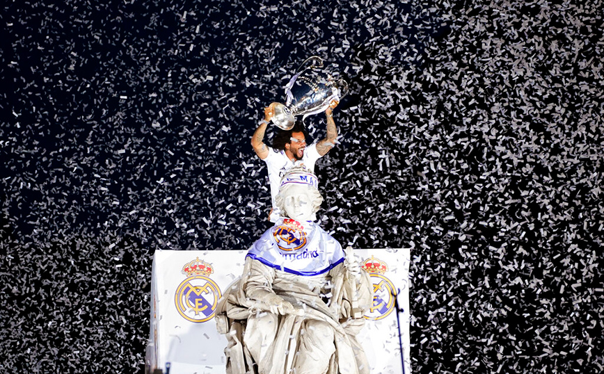 Ο παίκτης της Ρεάλ Μαδρίτης Μαρσέλο κρατάει το τρόπαιο στην πλατεία Cibeles κατά τη διάρκεια της παρέλασης των τροπαίων μπροστά από το Δημαρχείο της Μαδρίτης. Η Ρεάλ Μαδρίτης νίκησε 1-0 τη Λίβερπουλ στον τελικό του Champions League στο Παρίσι και στέφθηκε η νικήτρια της Ευρώπης.