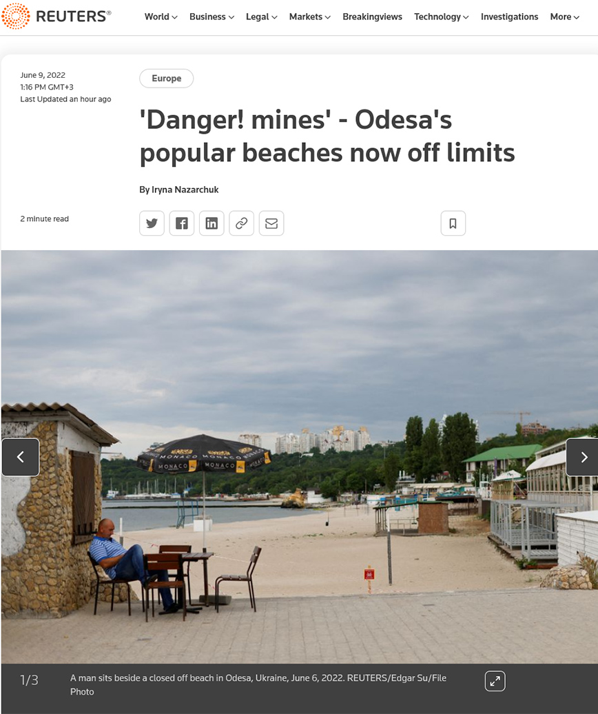 Συνήθως τα καλοκαίρια οι τουρίστες συνέρρεαν στο ουκρανικό θέρετρο της Οδησσού για να απολαύσουν τις παραλίες της Μαύρης Θάλασσας. Μετά όμως το ξέσπασμα του πολέμου τίποτα δεν θυμίζει τις παλιές καλοκαιρινές εικόνες. Η λευκή άμμος είναι γεμάτη νάρκες λόγω του πολέμου με τη Ρωσία και αστυνομικοί περιπολούν τα σημεία όπου έχουν δημιουργηθεί μονοπάτια με ξύλινες σανίδες.