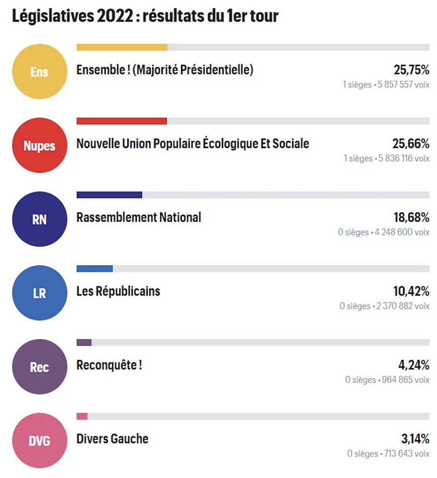 Σε ψήφους, η αριστερή συμμαχία «Nupes» της ριζοσπαστικής αριστεράς του Ζαν-Λικ Μελανσόν συγκέντρωσε μεταξύ του 25 και 26,2% των ψήφων έναντι 25 έως 25,8% για τον συνασπισμό «Μαζί», με τις δύο παρατάξεις να δίνουν μάχη στήθος με στήθος.