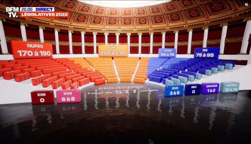 Η παράταξη του Εμανουέλ Μακρόν «Μαζί»χάνει την απόλυτη πλειοψηφία, αφού σύμφωνα με το ινστιτούτο Ipsos-Sopra Steria αναμένεται να συγκεντρώσει 224 έδρες – πολύ μακριά από τους 289 που χρειαζόταν.
