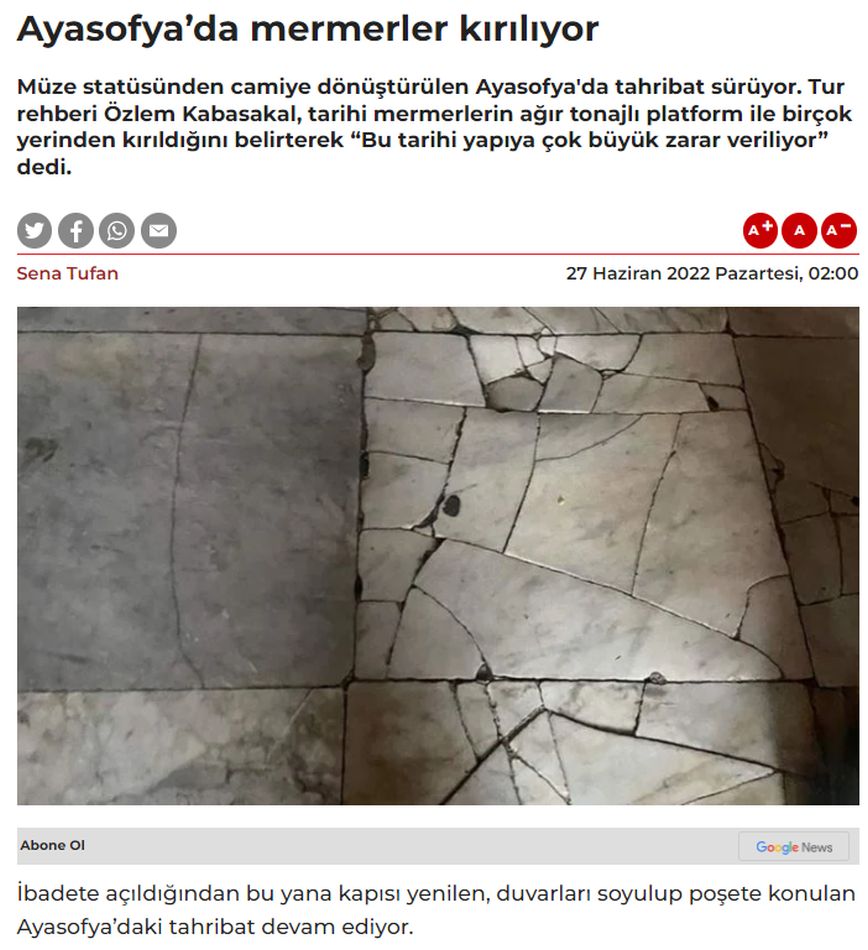 «Συνεχίζονται οι καταστροφές στην Αγία Σοφία, η οποία έχει μετατραπεί από μουσείο σε τζαμί. Η ξεναγός Οζλέμ Καμπασακάλ δήλωσε ότι τα ιστορικά μάρμαρα έσπασαν σε πολλά σημεία από το βαρύ μηχάνημα που χρησιμοποιήθηκε για τον καθαρισμό των μαρμάρων» σημειώνει η εφημερίδα.